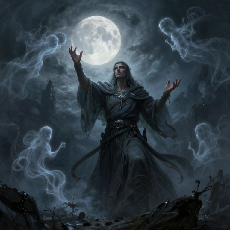 Digital art: Dark-robed, long-haired wizard under full moon, arms raised, surrounded by ethereal blue smoke spirits, amidst a spooky, cloudy