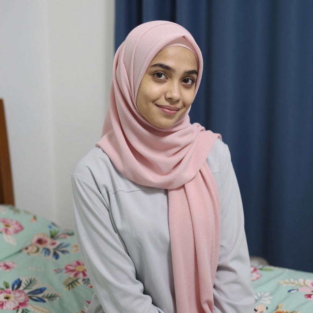 Photograph of a young woman with light skin and brown eyes, wearing a pink hijab and light gray long-sleeve top. She sits on a bed with a floral-patterned green and pink blanket, smiling softly. Blue curtains and a white wall are in the background.