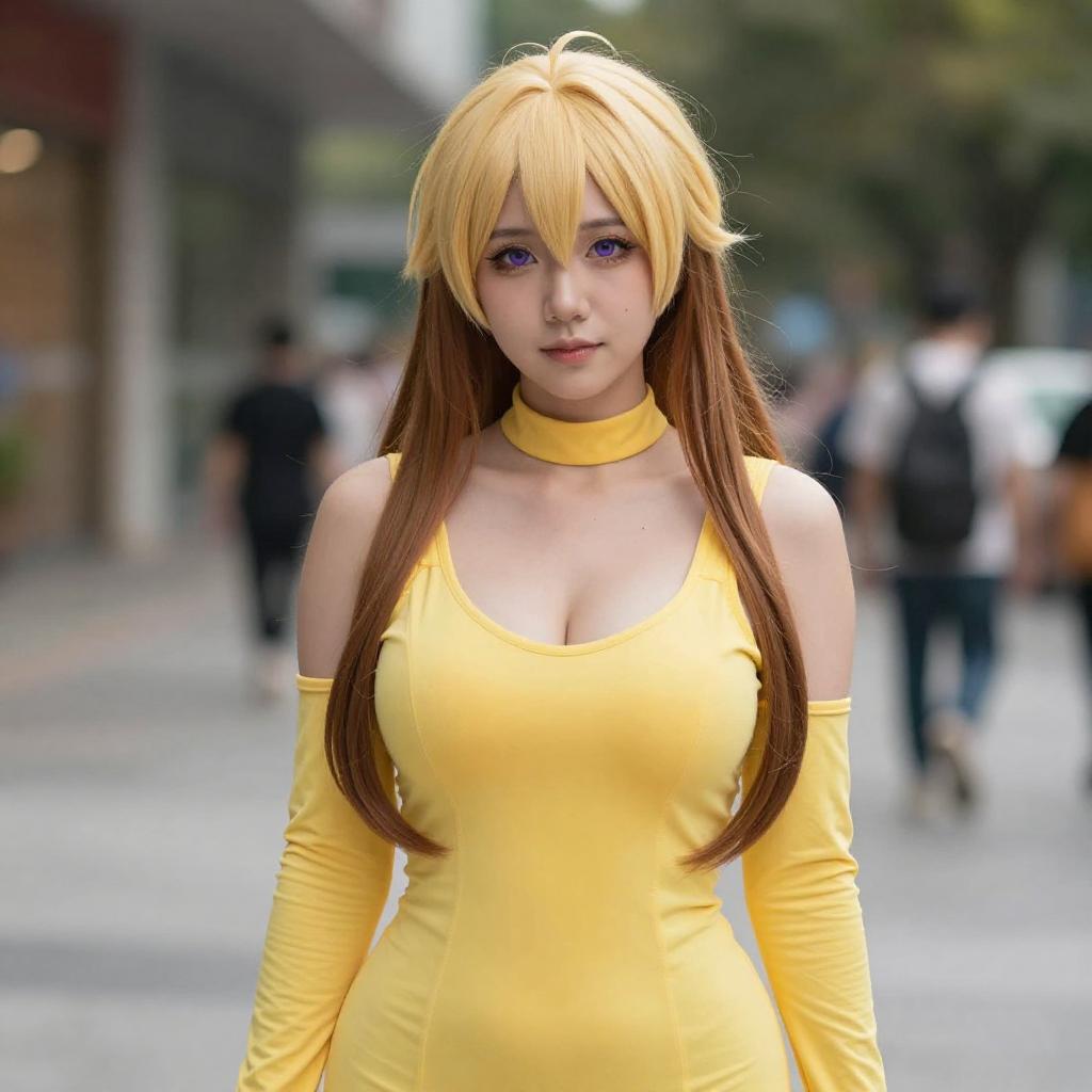 Close-up portrait of a woman dressed in a yellow bodysuit cosplay costume with blonde and brown long hair, purple eyes, and medium to large breasts, standing outdoors in natural lighting. The image features vibrant colors, realistic textures, a soft blurred background with shallow depth of field, and warm tones. The setting appears to be an urban street with pedestrians in the background.