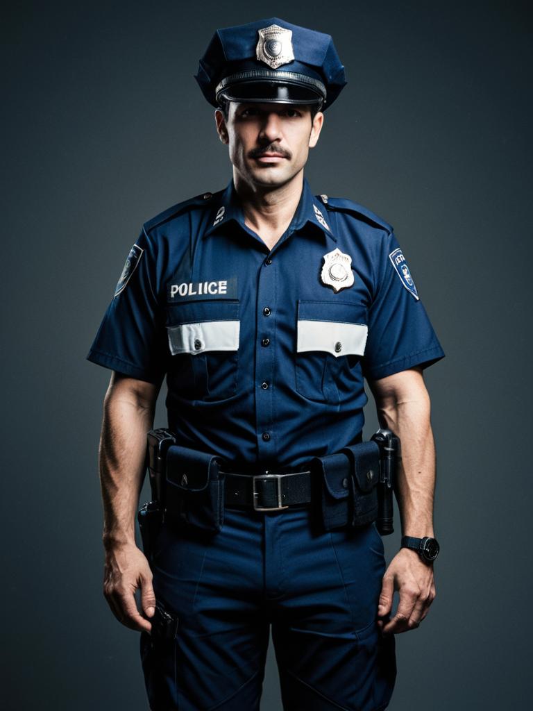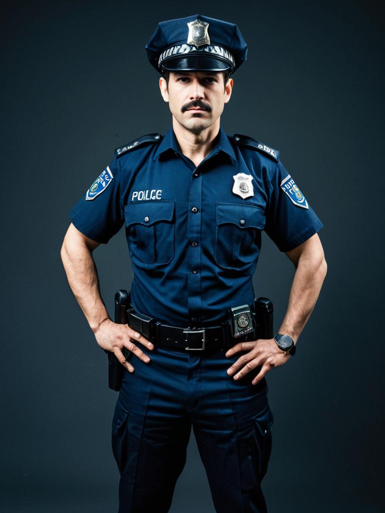 Full-body studio portrait of a man wearing a blue police uniform with a badge and police cap. The man has a mustache and is equipped with a utility belt, including handcuffs and other police gear. The background is plain and dark, highlighting the subject.