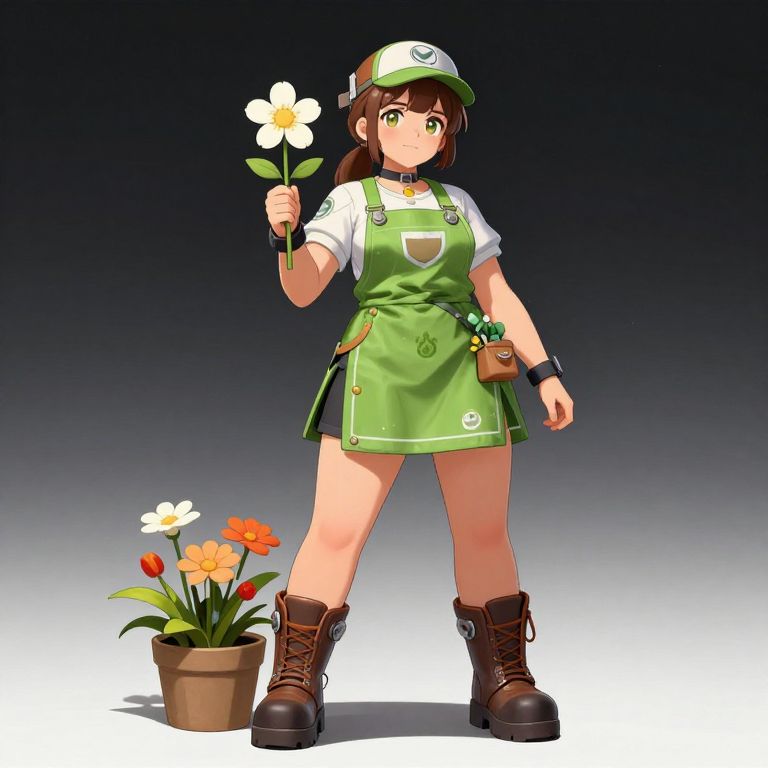 Vocal video game character portrait, teenage futuristic sci fi heavyset female florist holding a flower, full body pose, heavy boots, flirtatious, in the style of visual novels,