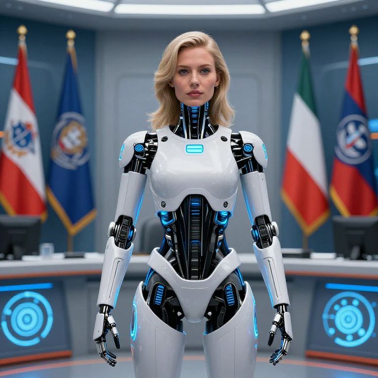 CGI image of a blonde, blue-eyed, humanoid robot woman with white and black armor, standing in a futuristic government office with flags and blue-l