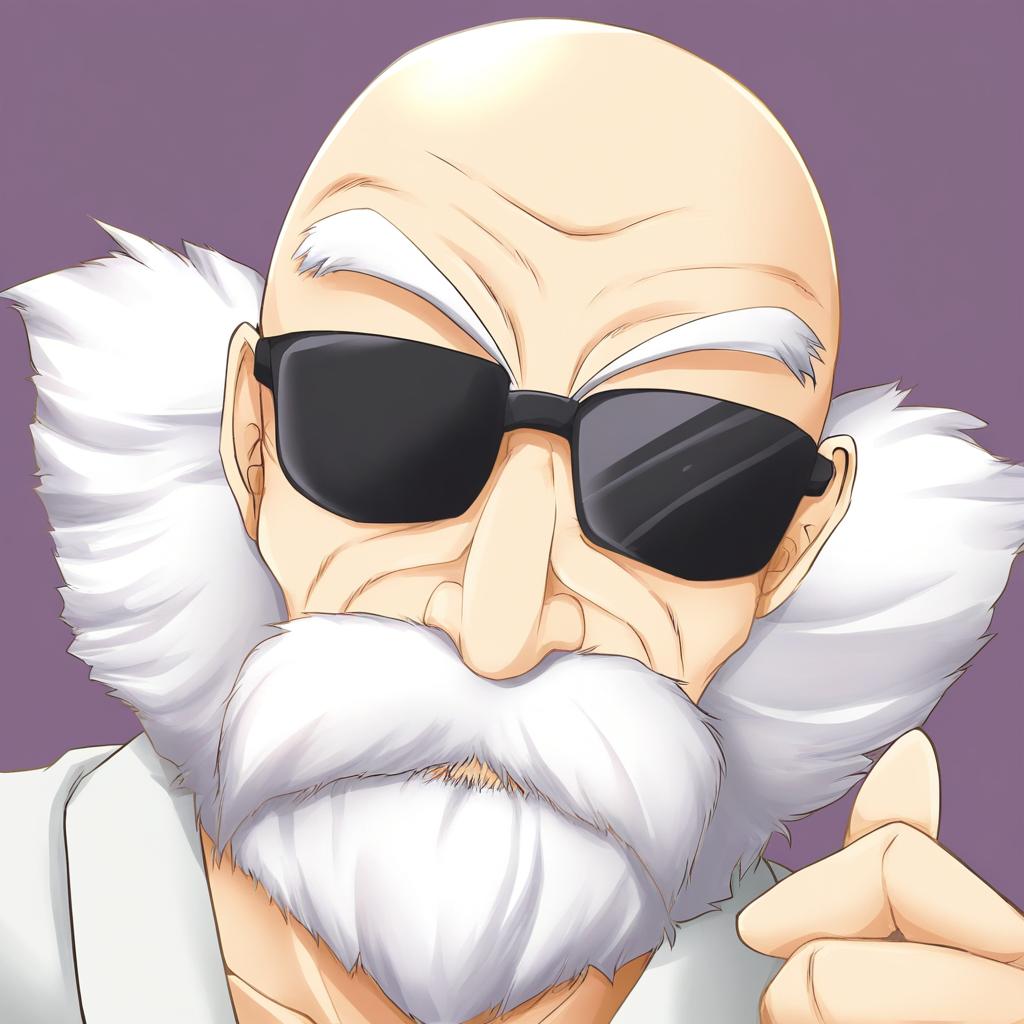 Muten roushi, dragon ball, 1boy, beard, mustache, white hair, sunglasses, bald, old man, by artist fukuda shuushi, leet