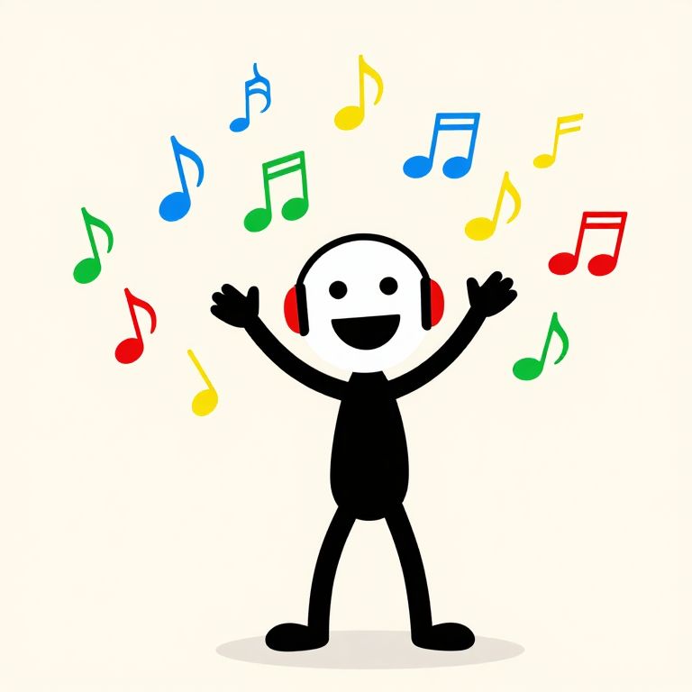 The image depicts a cheerful stick figure wearing ear defenders, with arms raised in a joyful gesture. The figure is surrounded by a vibrant array of musical notes in various colors, including blue, green, red, and yellow, creating a lively and energetic atmosphere. The musical notes are scattered around the figure, some appearing to be in motion, as if dancing or floating. The background is a soft, neutral color, allowing the colorful musical notes and the figure to stand out prominently. The overall composition is dynamic and engaging, with the figure and musical notes interacting in a playful and harmonious manner, suggesting a sense of happiness and celebration.