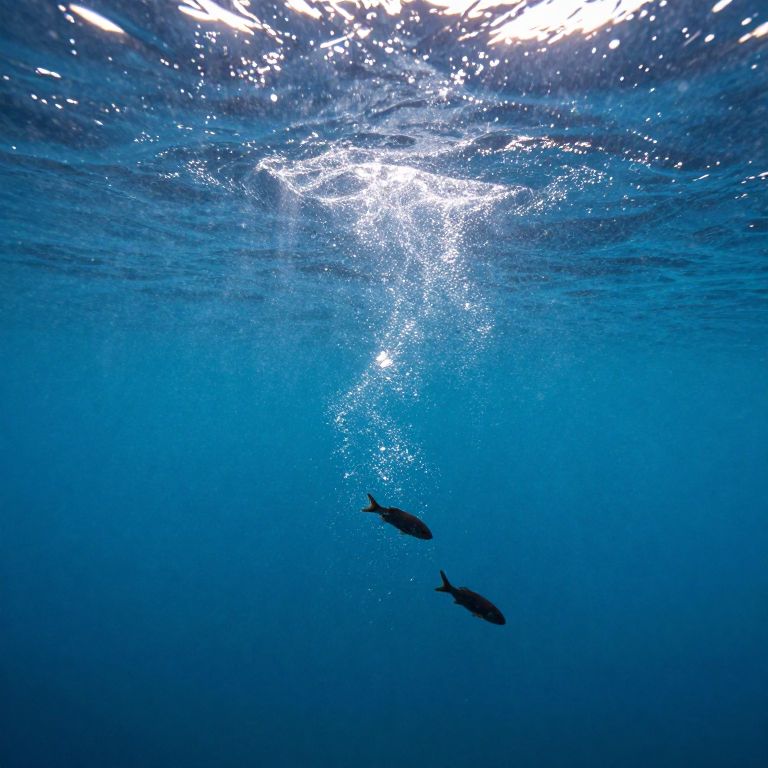 Photograph of an underwater scene with a deep blue background. Sunlight penetrates the water from above, creating a bright, sparkling effect near the surface. Three dark, silhouetted fish swim vertically downward, following the sunlight's path. The water is clear, revealing subtle textures and bubbles. The fish are evenly spaced and appear small in comparison to the vast, open water. The overall mood is serene and tranquil, with a strong contrast between the bright, sparkling sunlight and the dark, shadowy fish.