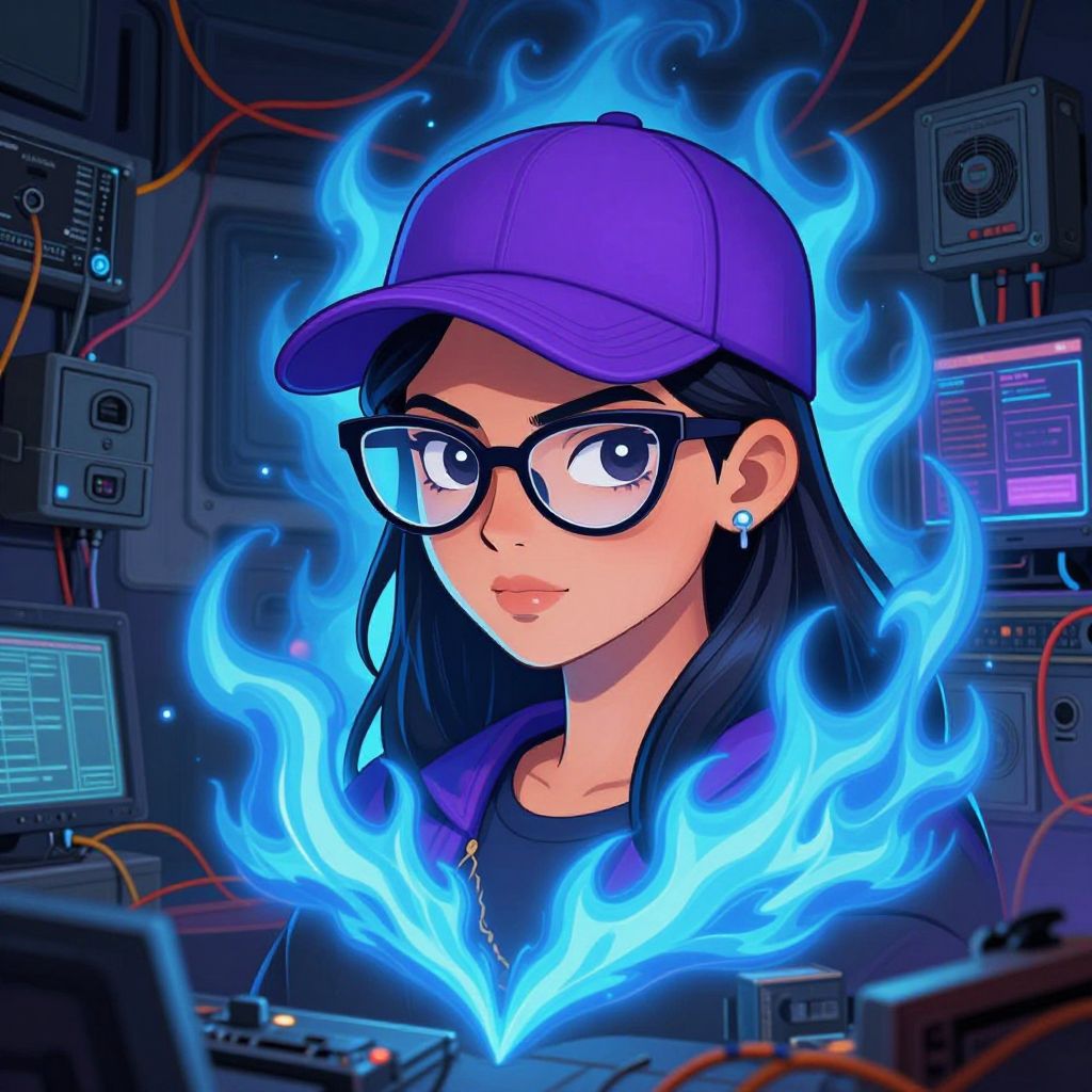 Character art by ruan jia, 20 year round faced hyderabadi woman wearing cateye glasses and purple baseball hat, on blue fire, blue fire powers, room filled with wiring and electronics with monitors