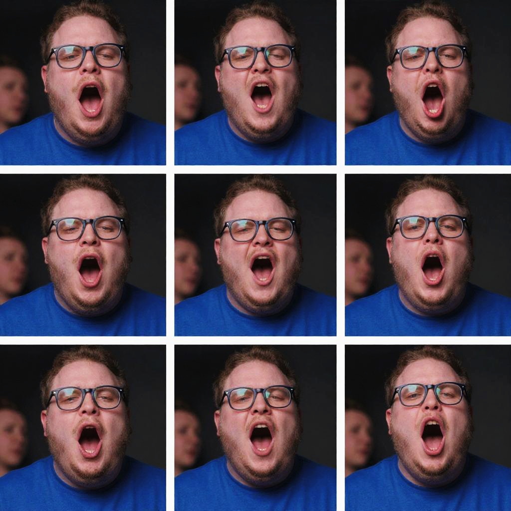Photograph collage of a bearded man in glasses, wearing a blue shirt, repeatedly opening his mouth wide against a dark background.