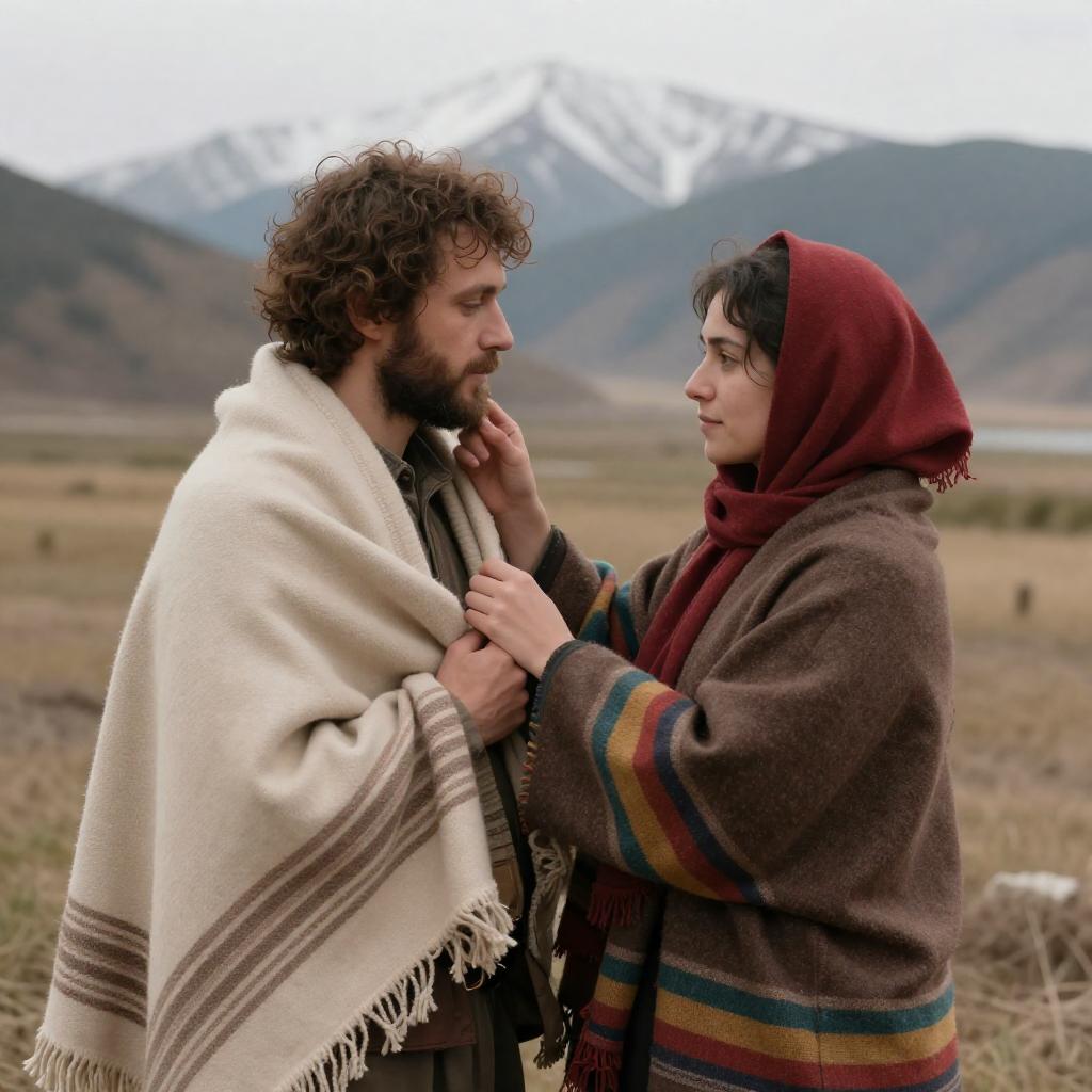 Photograph of a rustic indoor scene with a wooden table at the center. Six people, dressed in 19th-century clothing, gather around. One man with a mustache and beard sits in the middle, wearing a red shirt. A woman in glasses, wearing a white blouse, sits next to him. Other men and women, in various clothing styles, stand or sit around the table. The table has a basket, candle, and dishes. Background shows more people and wooden furniture. Warm, natural lighting. Intense expressions on some faces.