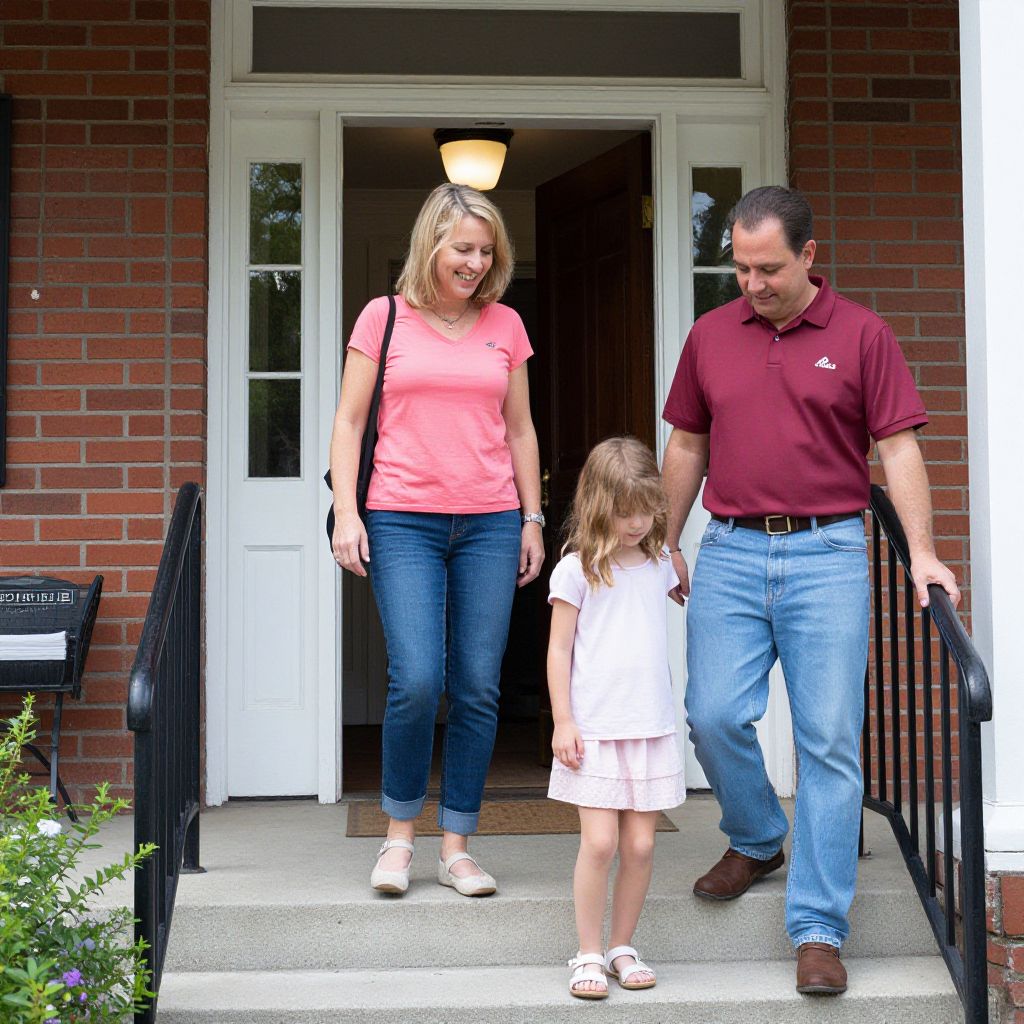 Photograph of a family standing on the brick-paved porch of a brick house with a white door. The mother, with shoulder-length blonde hair, wears a coral pink long-sleeve shirt and blue jeans, smiling at the father. The father, with short dark hair, wears a maroon button-up shirt and blue jeans, looking at the daughter. The daughter, with light brown hair, wears a white long-sleeve dress and white sneakers, playfully stepping down the black metal steps. The door has a lit lantern-style light above it. The background includes a black mail slot and white trim.