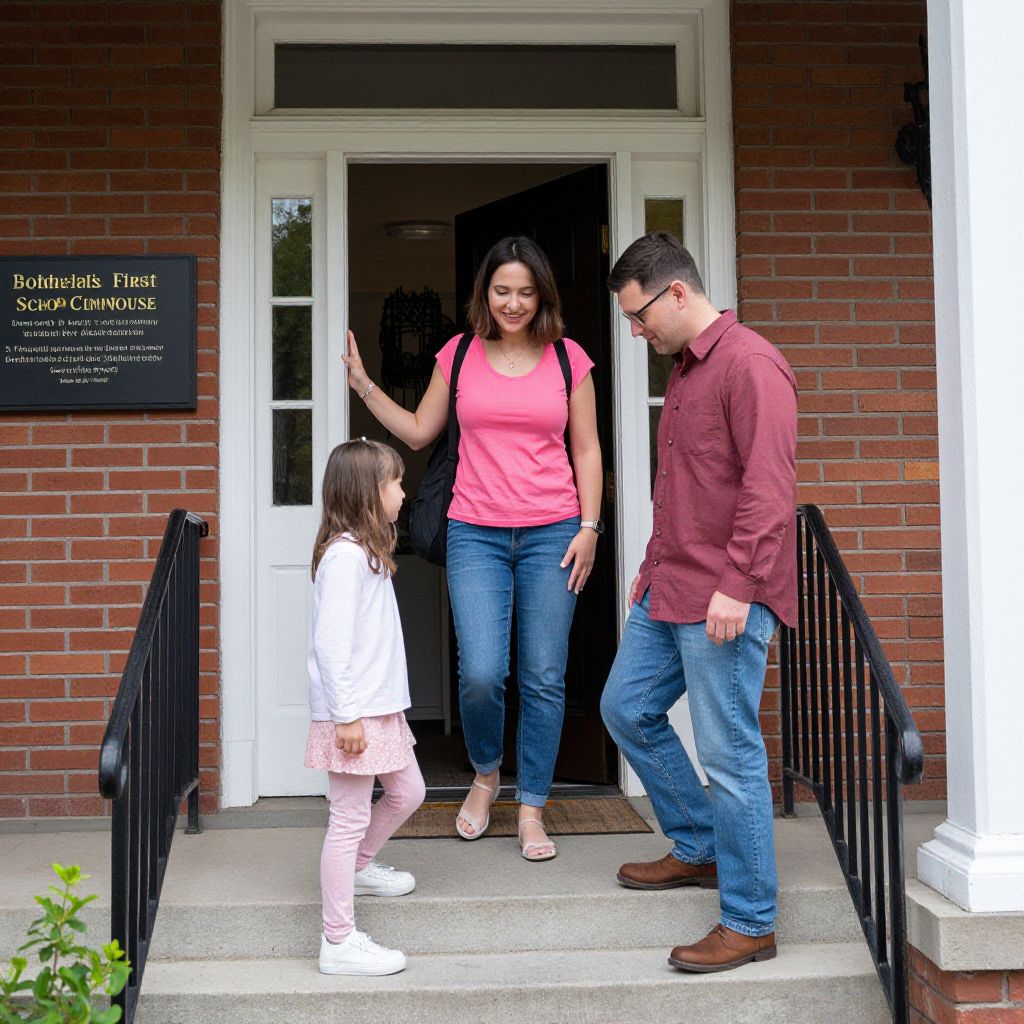 Family members exit the front door of Bothell's First Schoolhouse museum, with a woman in a pink shirt and jeans smiling warmly as two others descend the steps—one a child in light pink attire and another a man in a red shirt and jeans.