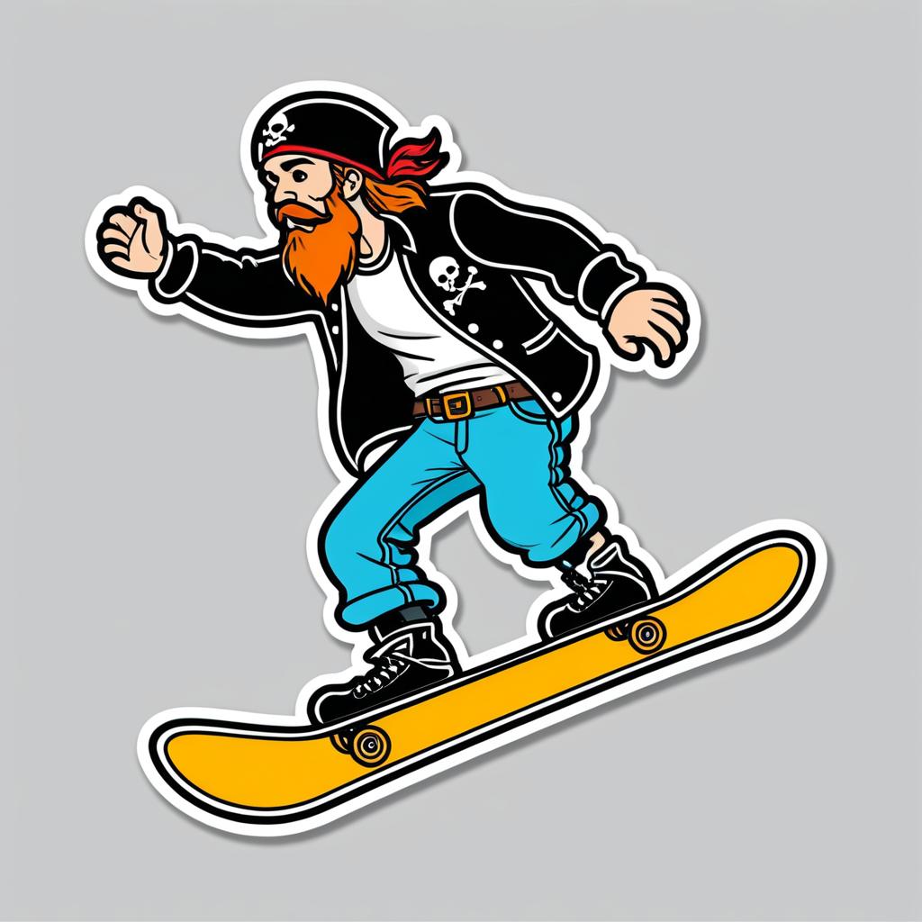 A pirate riding a snowboard, illustrated as a die-cut sticker. Simple, clean vector line art, with flat colors and a monochrome background. HDR, ultra-detailed, crisp outlines, cartoon aesthetic