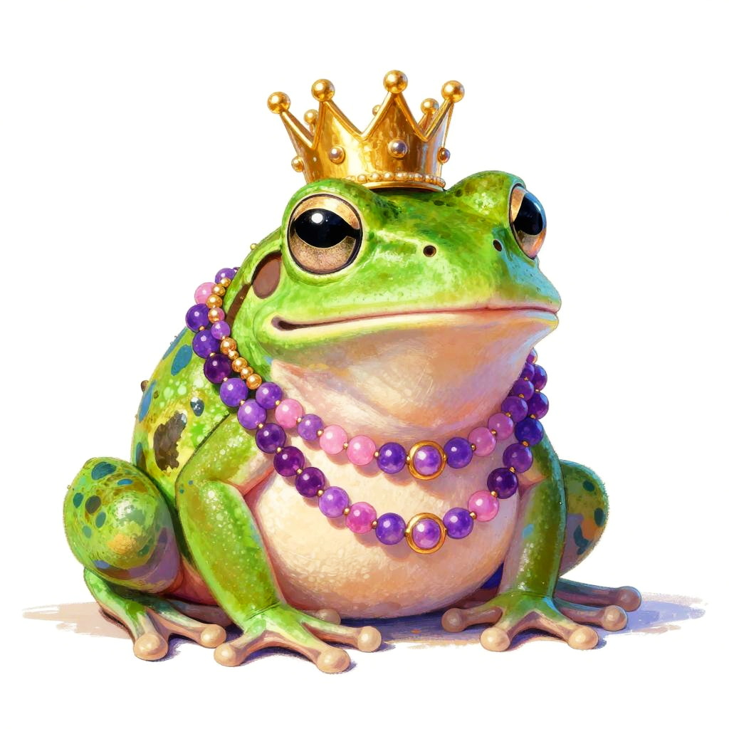 A vibrant digital drawing of a green frog wearing a gold crown and multiple layers of purple and pink beaded necklaces. The frog's large, dark eyes are expressive, and its skin is detailed with light green and blue spots. The beaded necklaces are adorned with gold accents, and a few beads are scattered on the white background. The overall style is whimsical and fantastical.