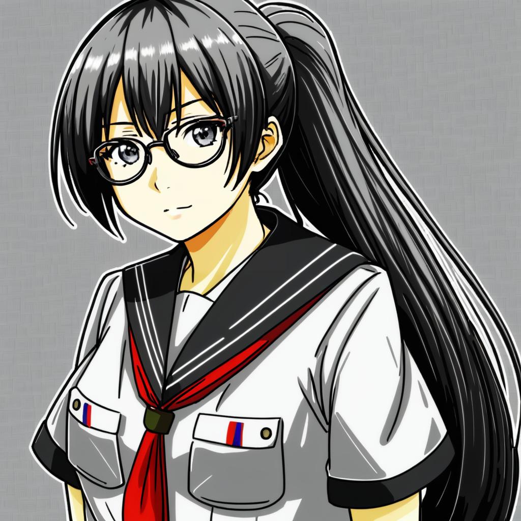 Digital illustration of an anime-style girl with very long black hair tied in a ponytail, wearing glasses and a traditional Japanese school uniform (serafuku) featuring a black collar and red scarf. She has grey eyes and asymmetrical bangs, depicted in a clean anime art style inspired by Kantai Collection characters.