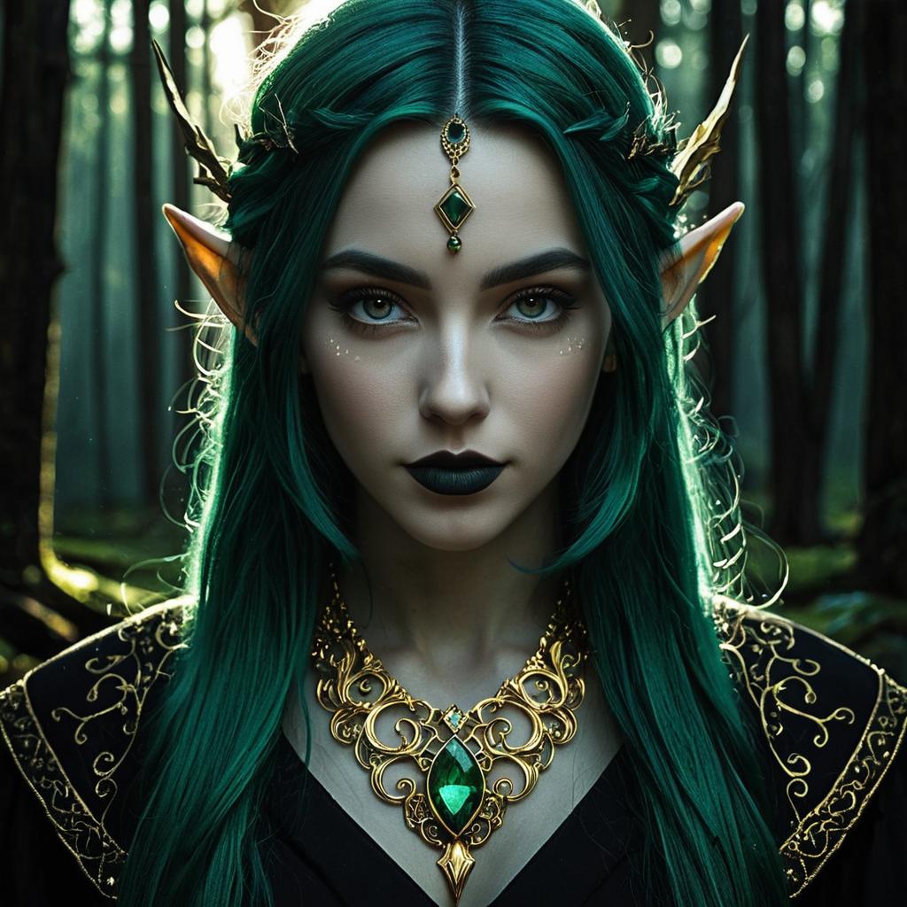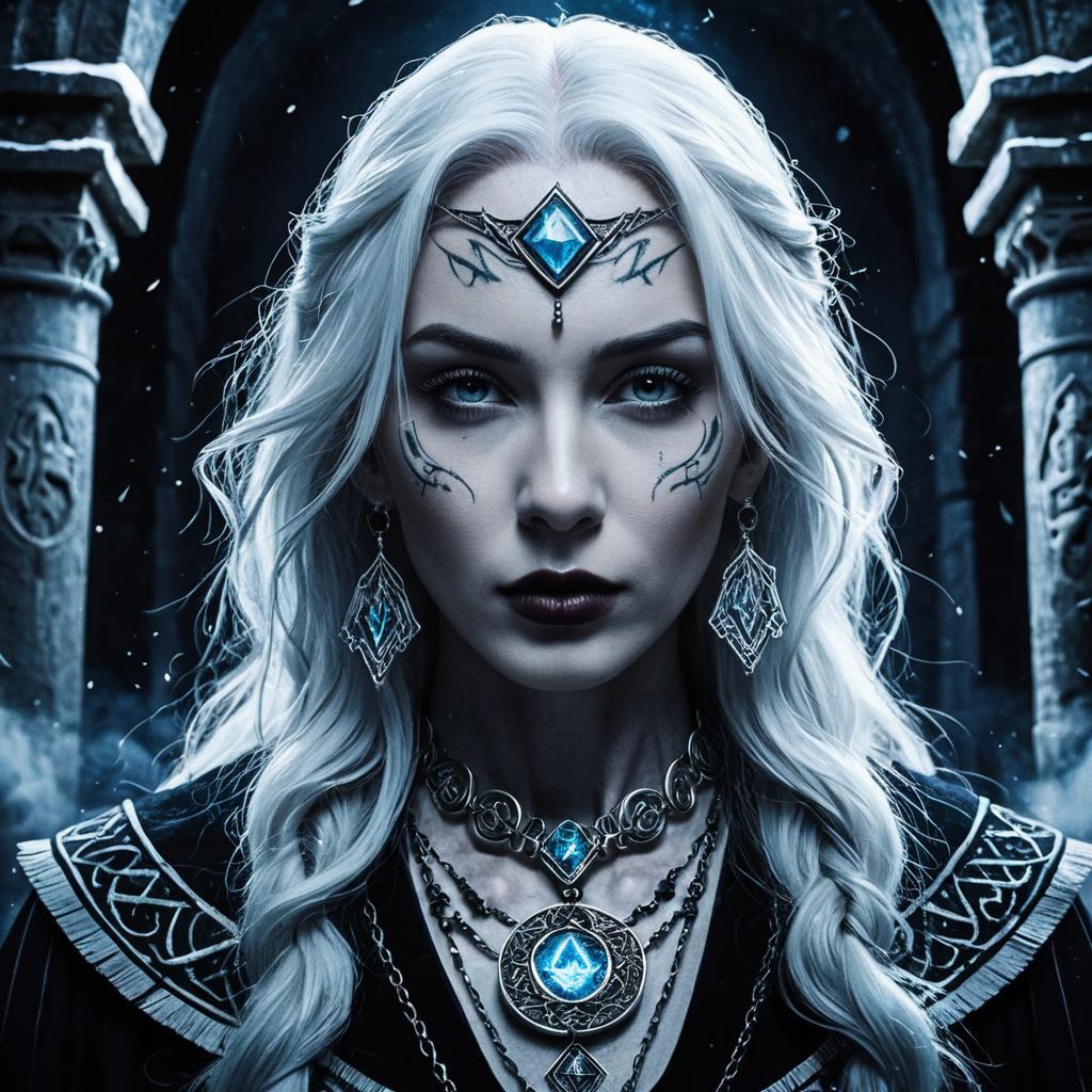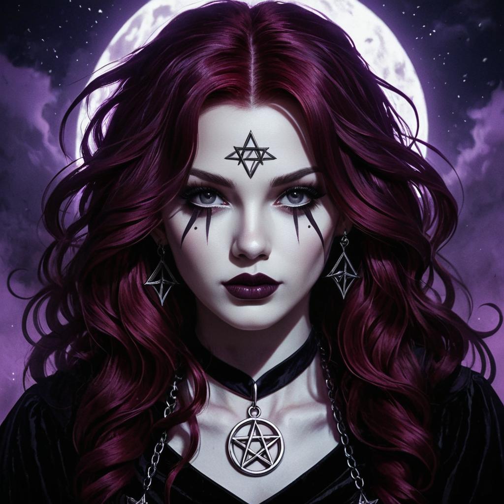 A highly detailed digital anime-style portrait of a dark-haired enchantress with striking violet eyes and pale complexion, wearing a obsidian pendant on a slender silver chain, black lipstick, intense shadows creating dramatic lighting on her face. Background with deep indigo mist intertwined with luminescent wisps, smooth shading, sharp and clean lines, atmospheric mood, gothic and mystical aesthetic.