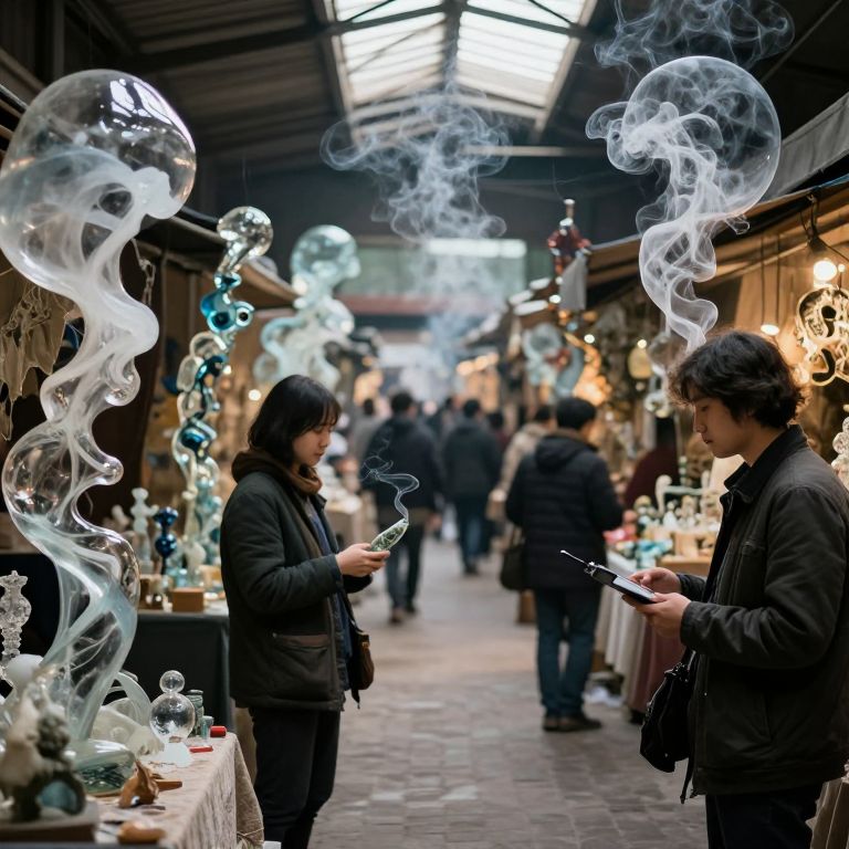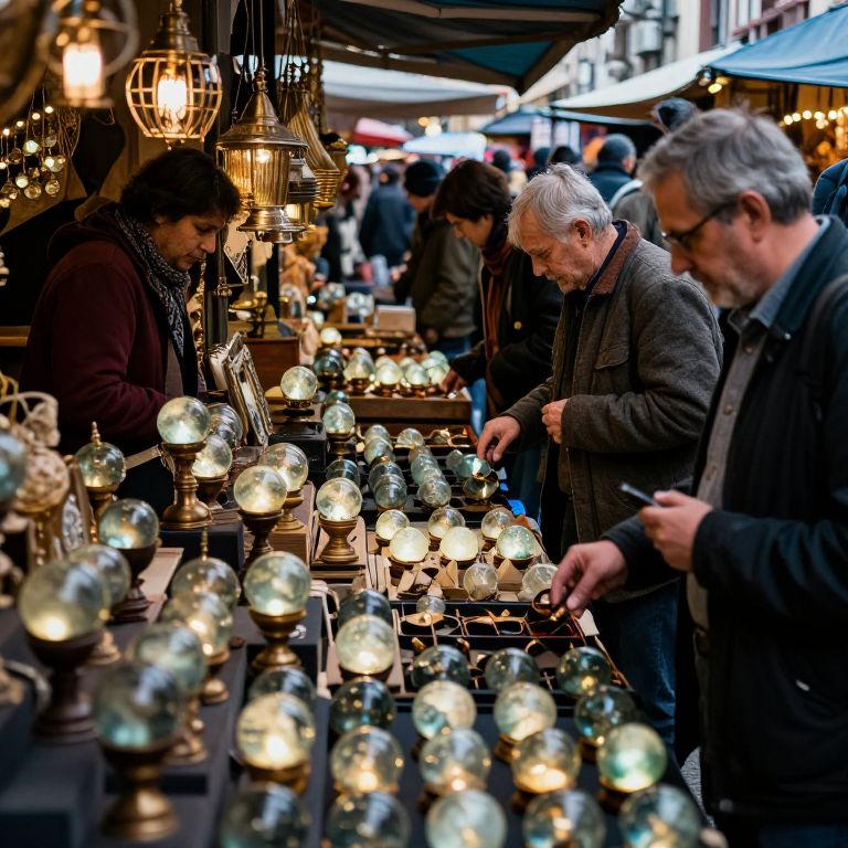 A bustling marketplace where merchants trade in forgotten memories, sealed in glass orbs that glow with hazy recollections.