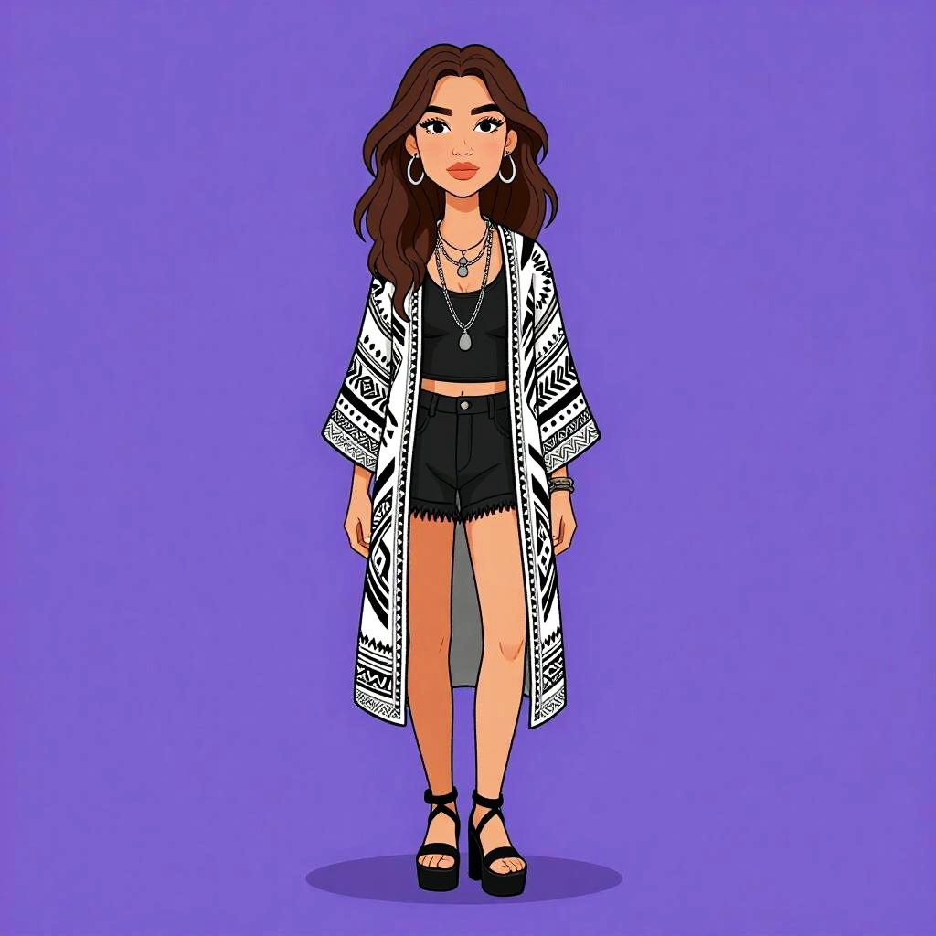 Woman with pretty face and pretty hair. Woman, bohemian, long open-front cardigan with black and white tribal print, grey tones, layered over a black tank top, black shorts with fringe hem, black strappy platform sandals, layered necklaces. --sref 1461