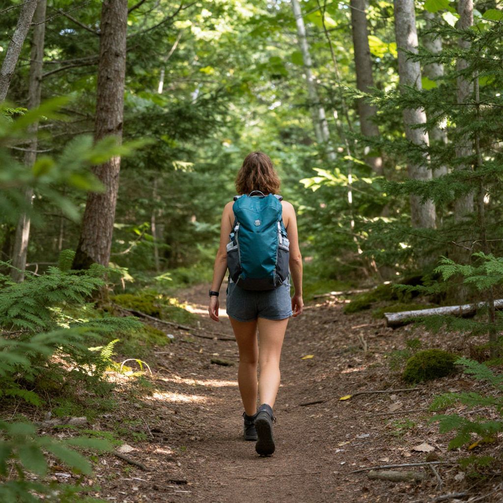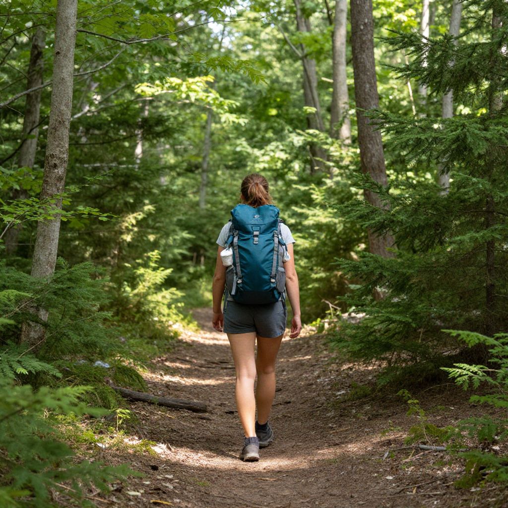 Woman hiking through a serene forest trail in New Hampshire, carrying a teal backpack and wearing shorts, with sunlight filtering through the lush green trees.