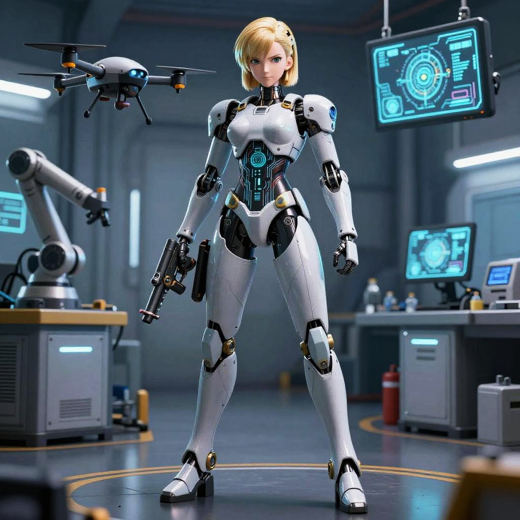Realistic photo.A mecha-inspired Android 18, with sleek metallic finish with integrated circuits, holographic display elements and dual pulse rifles mounted on her forearms, a tactical drone companion hovering nearby, standing tall in a high-tech laboratory with glowing data displays and robotic assembly stations. realistic photo