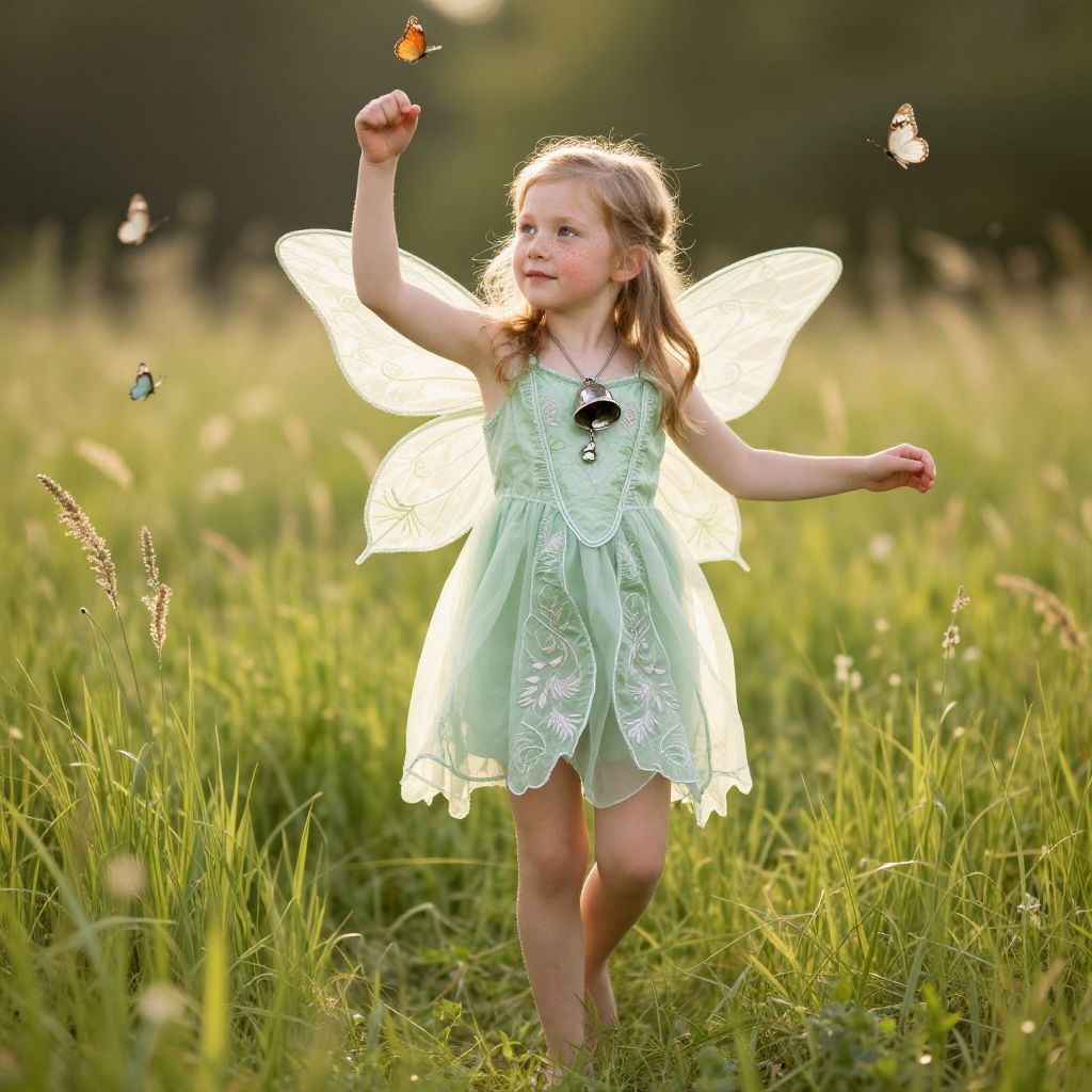 A small, fairy-like girl with freckles and rosy cheeks wears a detailed light green fairy costume with embroidered wings and a silver bell around her neck. She is dancing in a field of tall green grass during a sunny afternoon, with butterflies swirling around her. The scene is captured in a warm, realist style with soft shadows and natural lighting.