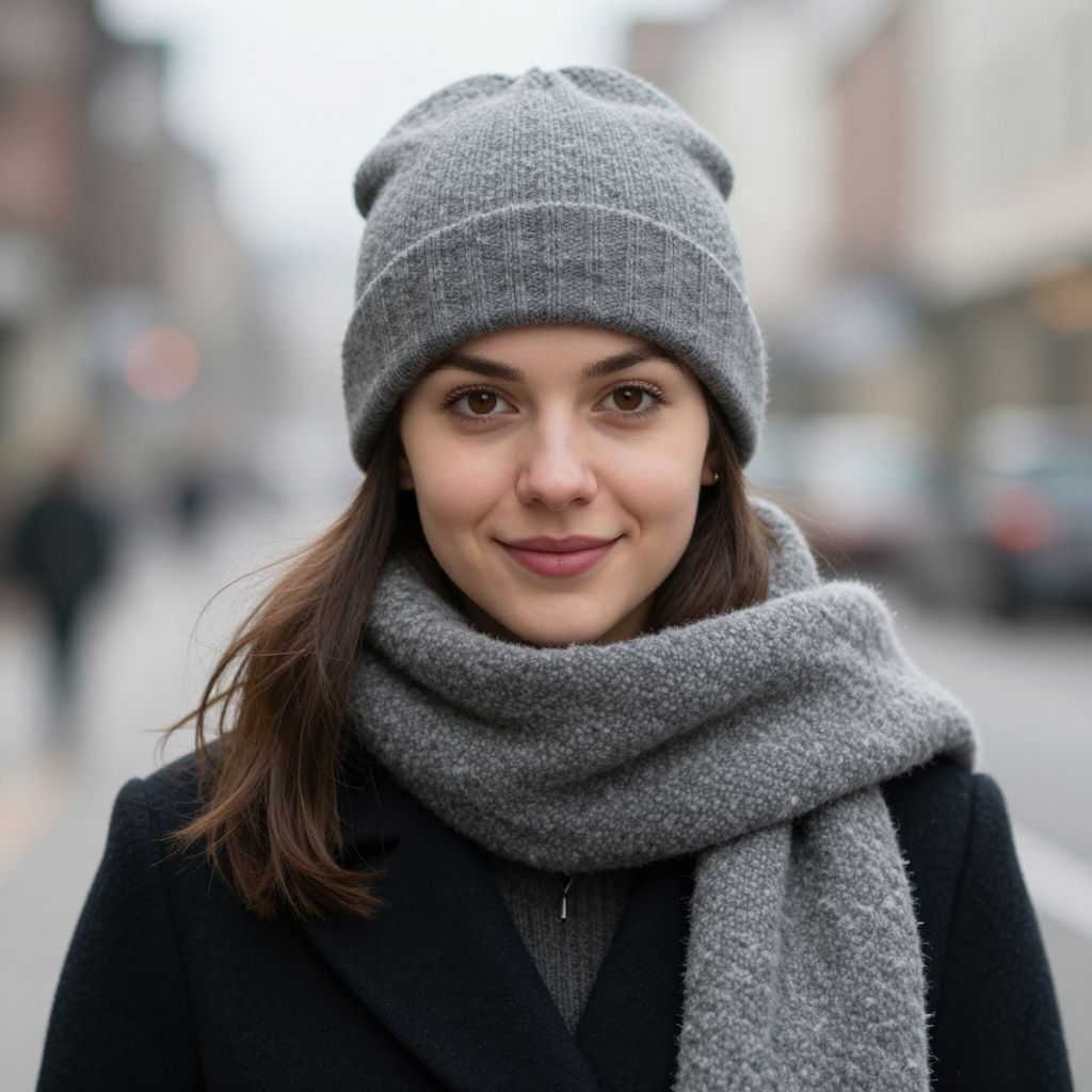 Photograph of a young woman with fair skin and dark brown eyes, wearing a gray knit beanie and matching thick scarf wrapped around her neck. She has straight, shoulder-length brown hair and is dressed in a black coat. She smiles slightly, with natural makeup. The background is a blurred city street with indistinct buildings and a few people, suggesting a cold, urban winter day. The overall color palette is cool, dominated by grays and blacks, with the soft texture of the knitwear contrasting against her smooth skin. The image has a shallow depth of field, focusing on the woman while the background remains out of focus.