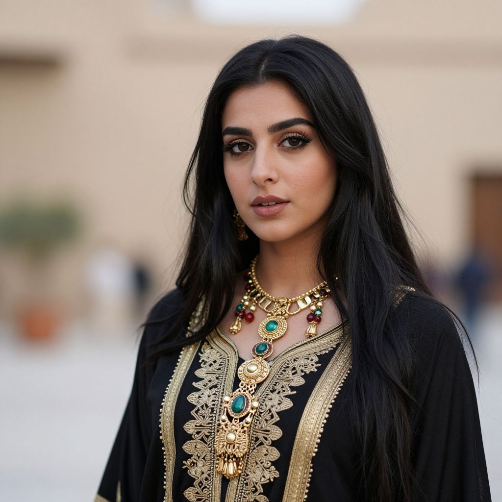Photograph of a beautiful Middle Eastern woman with long black hair, wearing an ornate gold and green necklace, black embroidered robe, standing in a blurred