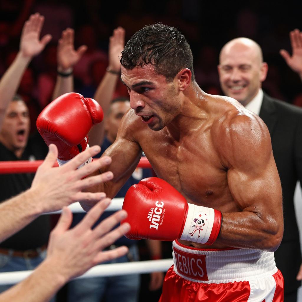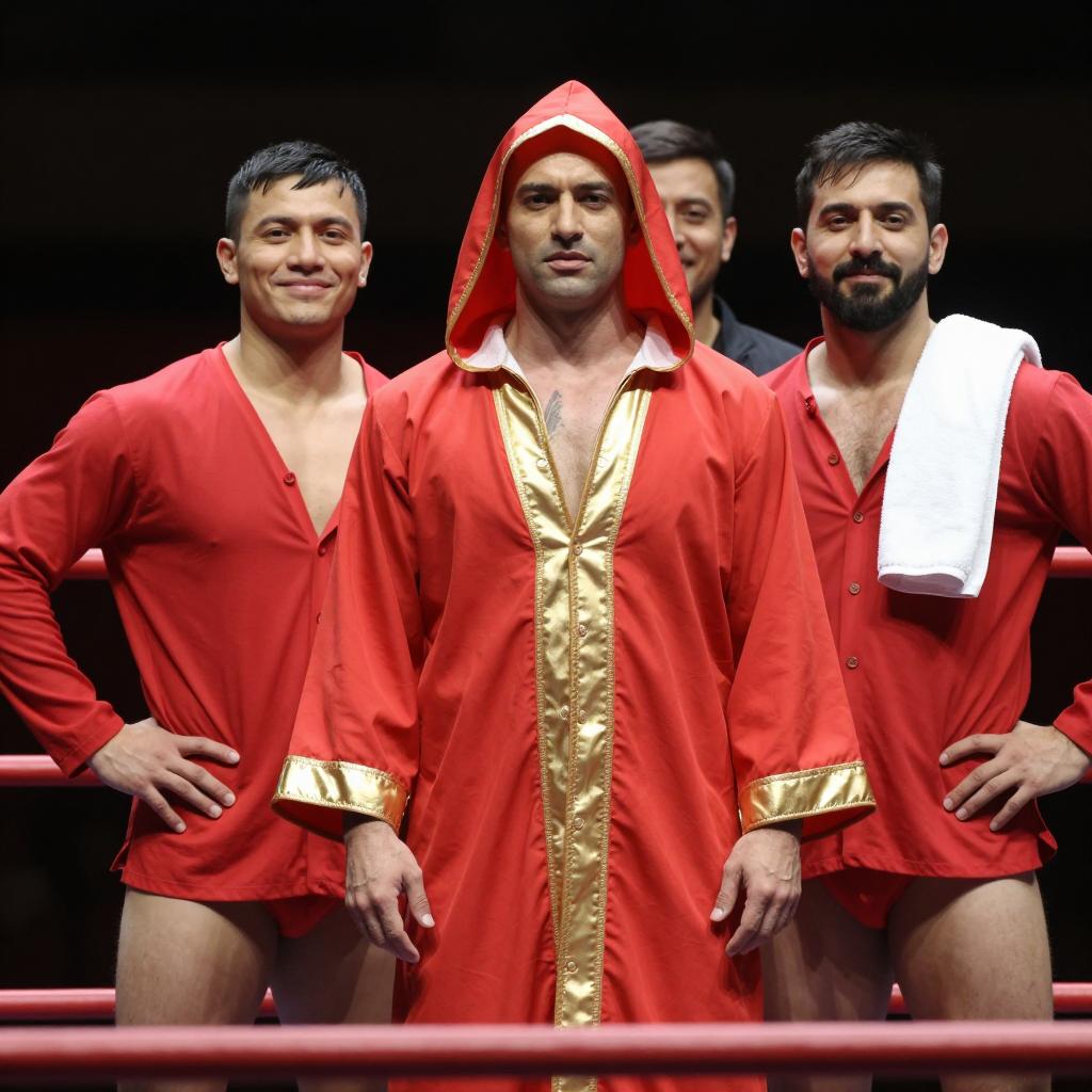Photograph of four men standing in a ring. Central man in red and gold hooded robe, white scarf, hands by sides. Man on left in red cardigan, hands on hips, slight smile. Man on right in red cardigan, white towel over shoulder, slight smile. Background man partially visible, smiling. Dark background, red ring ropes.
