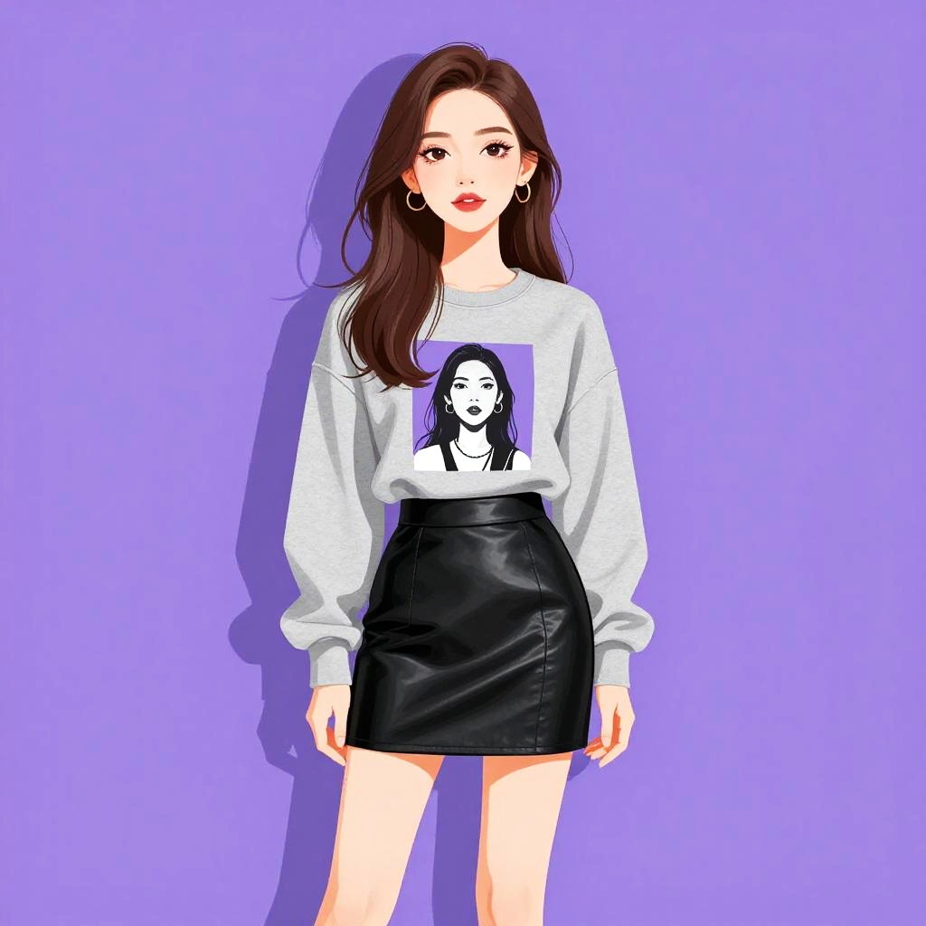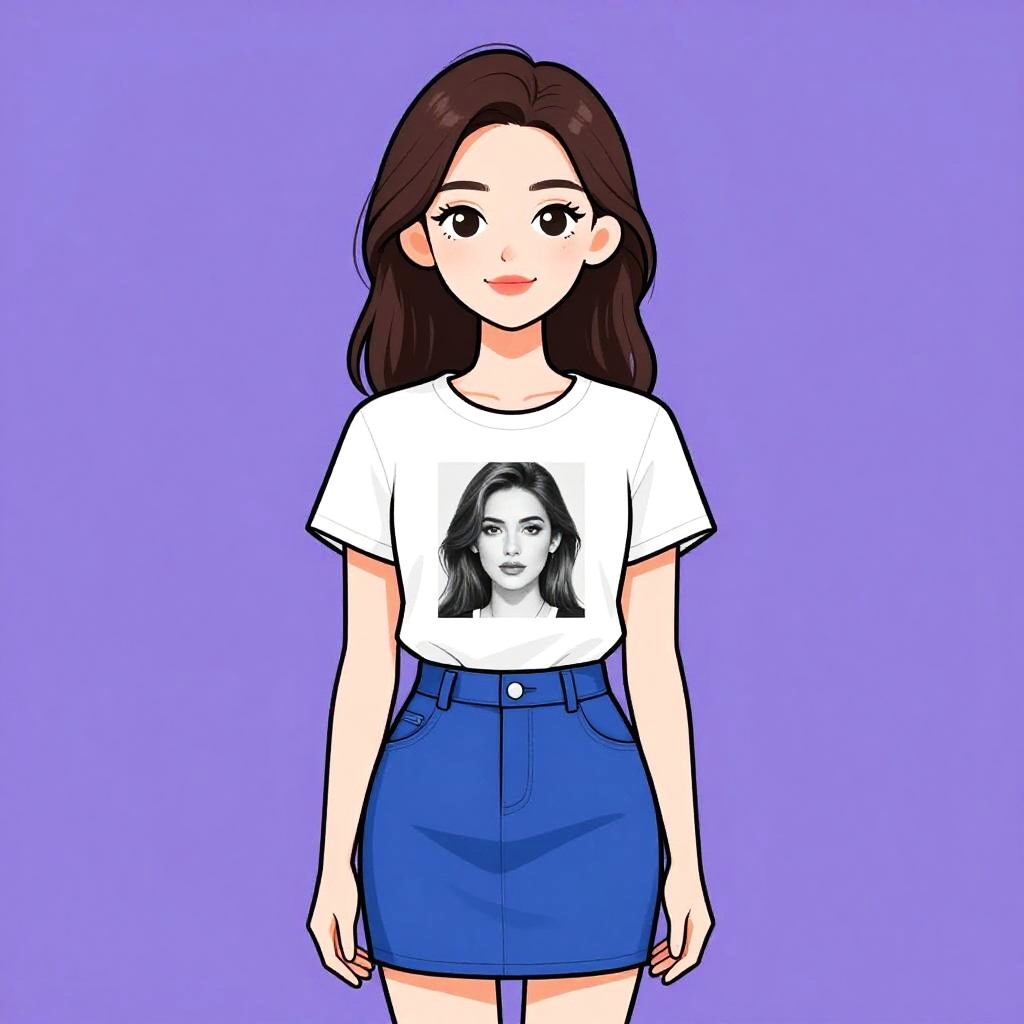Woman with pretty face and pretty hair. Woman, casual, white graphic t-shirt with a monochromatic face print, short sleeves, crew neck, cobalt blue mini skirt with a structured fit. --sref 1467
