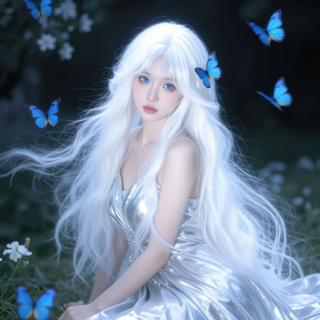 White hair girl with piercing blue eyes, wearing a flowing silver gown, surrounded by floating blue butterflies, enchanted garden background, high contrast and dreamy vibe