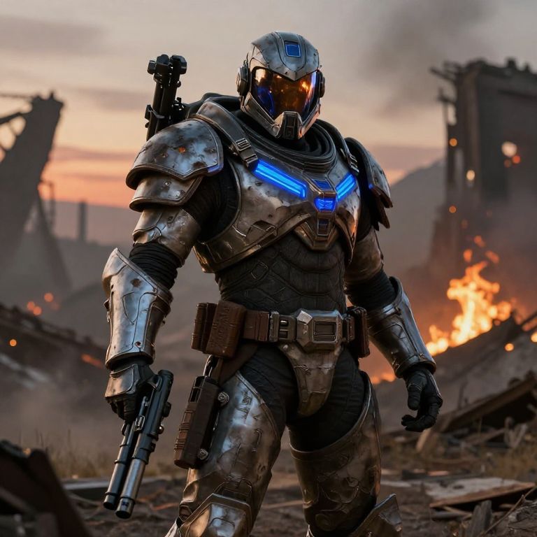 Photorealistic CGI of a futuristic, armored soldier with glowing blue chest emblem, holding a gun, standing in a burning, ruined cityscape.