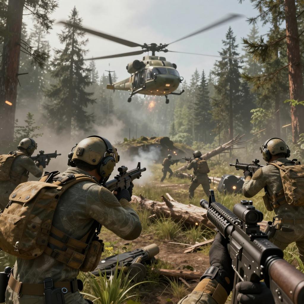 Hyper-realistic scene of a light reconnaissance military unit performing a helicopter drop insertion into a dense forest combat zone. Soldiers equipped with compact submachine guns, tactical headsets, and detailed armor engage distant enemies. Fallen trees, foggy light, sparks, and smoke create a cinematic, intense battlefield atmosphere. The image offers an over-the-shoulder view aiming down assault rifle sights with dynamic composition and high detail in equipment and environment.