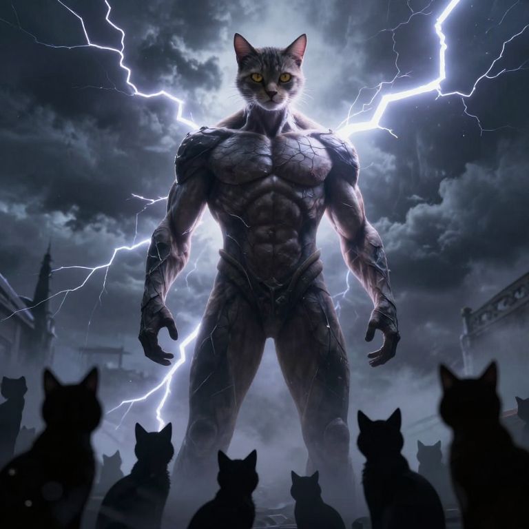 In a dramatic digital art rendering, a muscular humanoid figure with feline features stands illuminated by striking lightning bolts against a stormy backdrop, commanding the attention of a somber audience of silhouetted cats below.