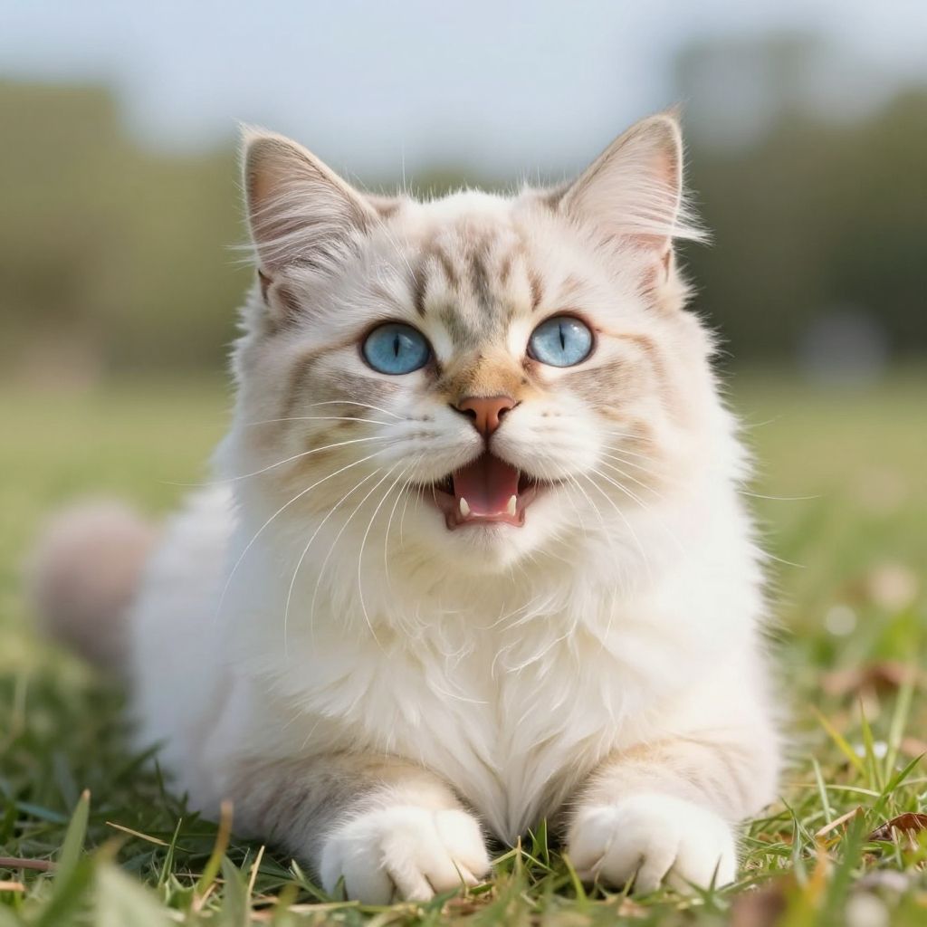 8K. Celtic persian cat with light blue eyes, with four paws, happy, enjoys the sunny time in a nature landscape. (Rendernet, realistic cat)