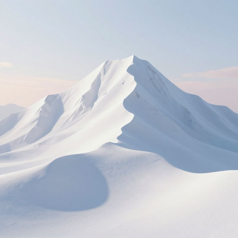A serene 3D-rendered landscape features a majestic snow-covered mountain with fluid, origami-like folds, casting a subtle silhouette against a soft, ethereal sky, evoking a sense of daily transformation and surreal realism.