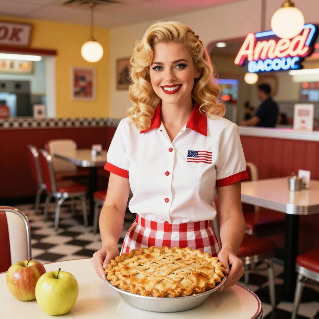 American pie blonde waitress serving apple pie in a classic diner with checkered floors and neon signs, 1950s Americana style, warm cozy atmosphere, realistic textures and vivid details.
