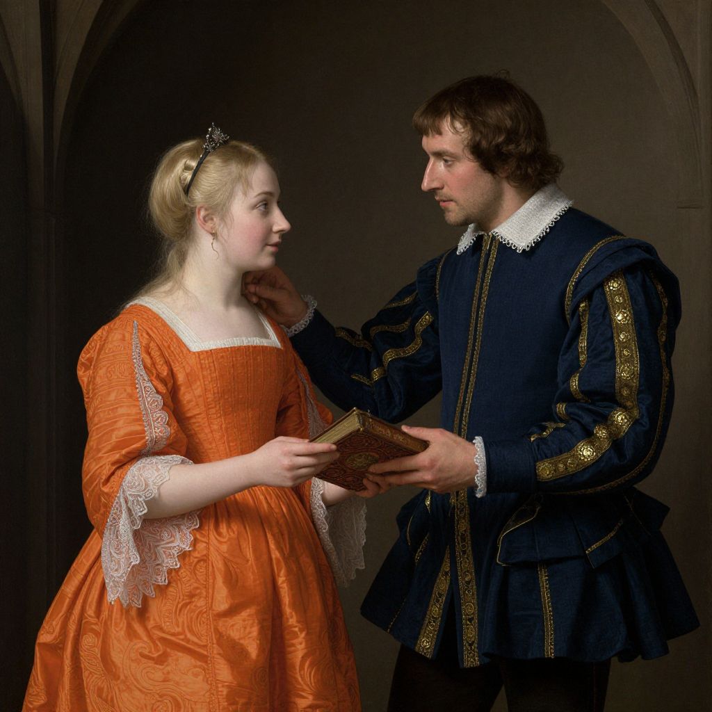 Photograph of a 17th-century styled portrait: a young man in dark, gold-trimmed jacket hands a book to a blonde woman in