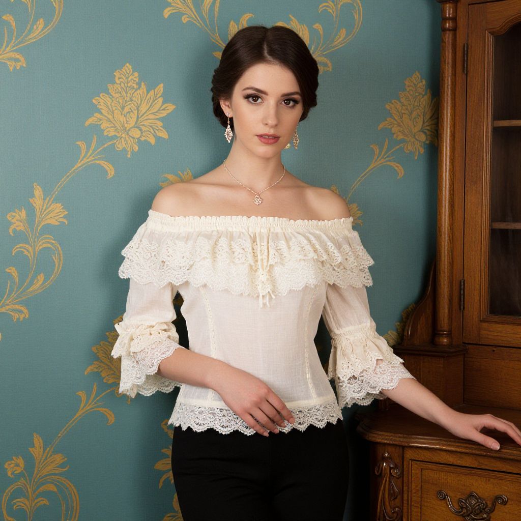 Elegant woman in a Victorian-inspired off-the-shoulder blouse with ruffled sleeves and lace detailing stands against a teal wall adorned with gold floral patterns, her hair styled in a neat bun and complemented by a delicate necklace and dangling earrings, while a wooden cabinet with ornate details rests to her right.