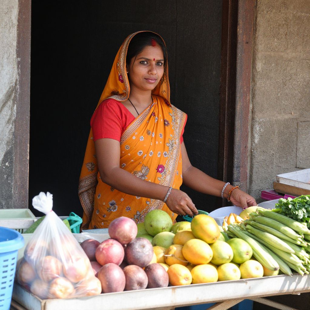 A photorealistic Indian woman in her 30s sells fresh fruits and vegetables in her shop front on a bright sunny day.