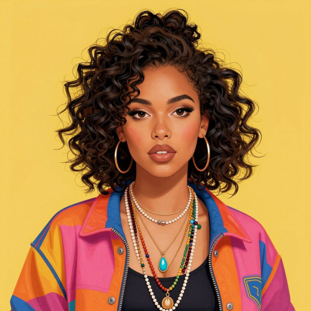 Digital portrait of a confident Black woman with curly hair, wearing a colorful jacket, hoop earrings, and layered necklaces, against a yellow background.