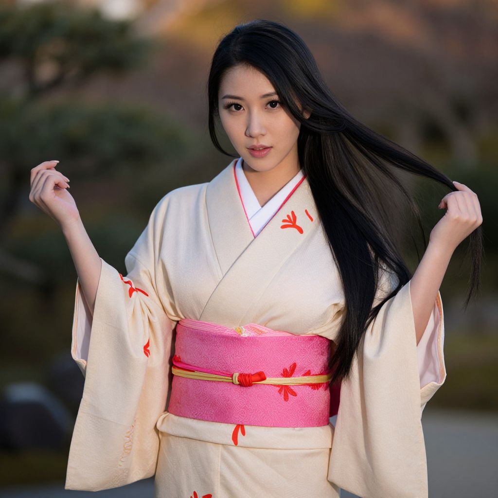 Photograph of an Asian woman with long black hair, wearing a white kimono with red floral accents and a pink obi, holding her hair,