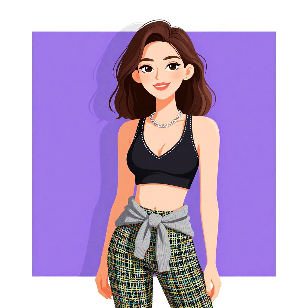 Illustration of a young woman with a pretty face and wavy brown hair, smiling confidently. She is wearing a black V-neck sports bra with white decorative stitching, high-waisted green and yellow speckled tweed trousers, and a grey knit sweater tied around her waist. She accessorizes with a silver chain necklace and small earrings. The background is a solid purple square on a white backdrop.