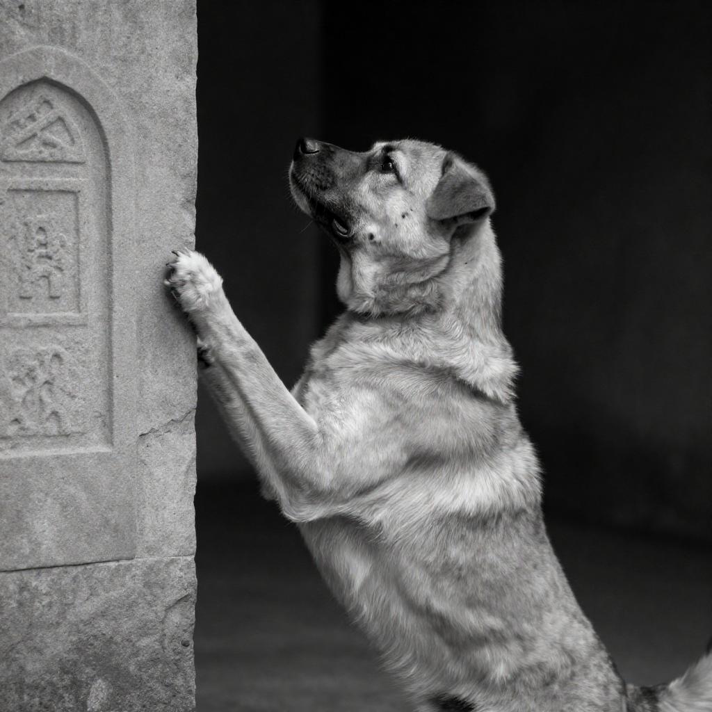 Black and white photograph of a medium-sized dog with a short coat, standing on its hind legs, paw raised, pressing against a stone wall with visible ures and an engraved surface. The dog's head is tilted upward, mouth slightly open. The wall has engraved and a small arch. The dog's ears are perked, and its expression is focused. The background is dark, with strong contrasts. The image has a gritty, high-contrast style. One dog, stone wall, engraved .