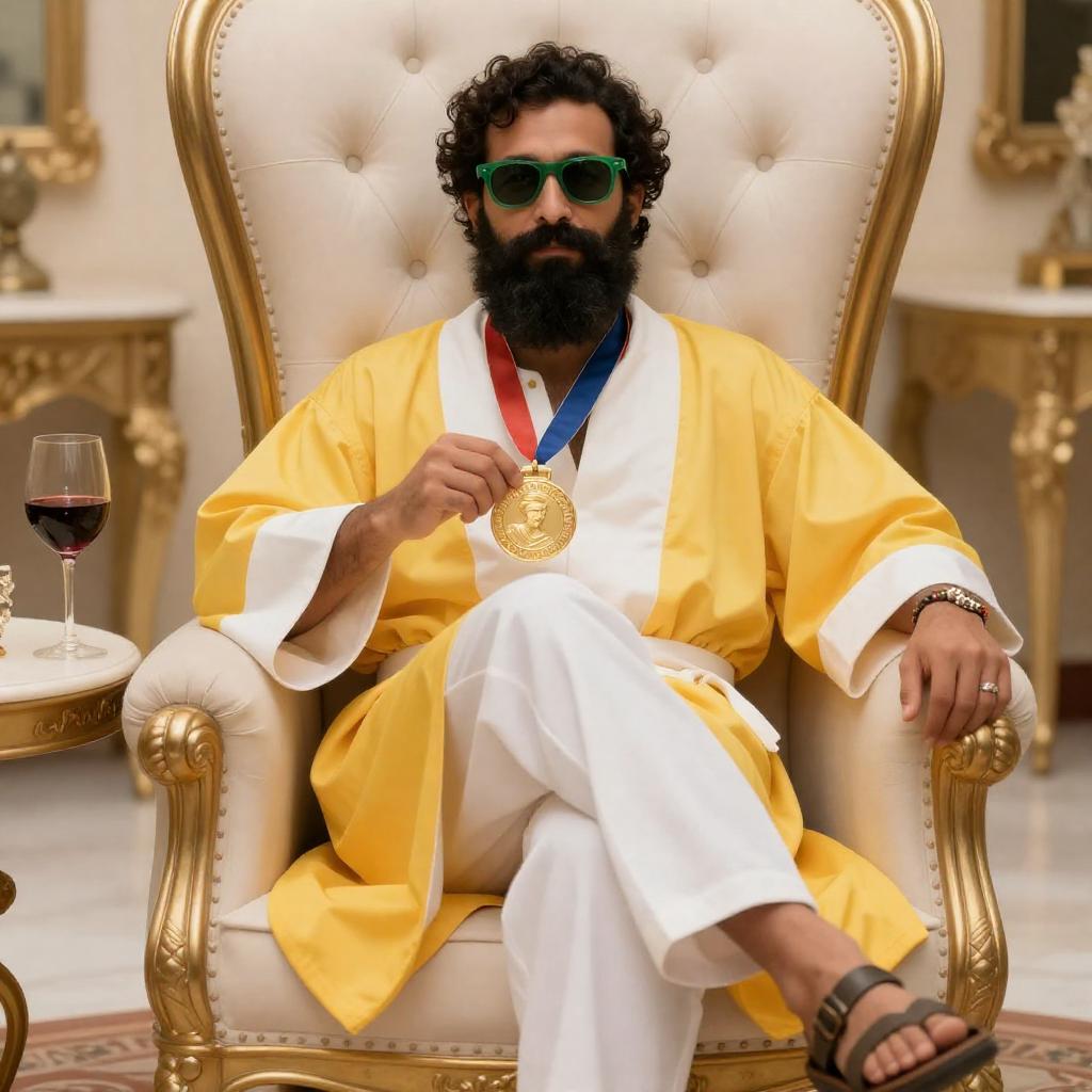 A man with a thick black beard and curly hair, wearing green sunglasses, a yellow and white robe, white pants, and sandals, sits in a large, tufted, cream-colored chair. He holds a medal and has a relaxed pose. A glass of red wine is on the table to his left, with gold-trimmed furniture in the background.