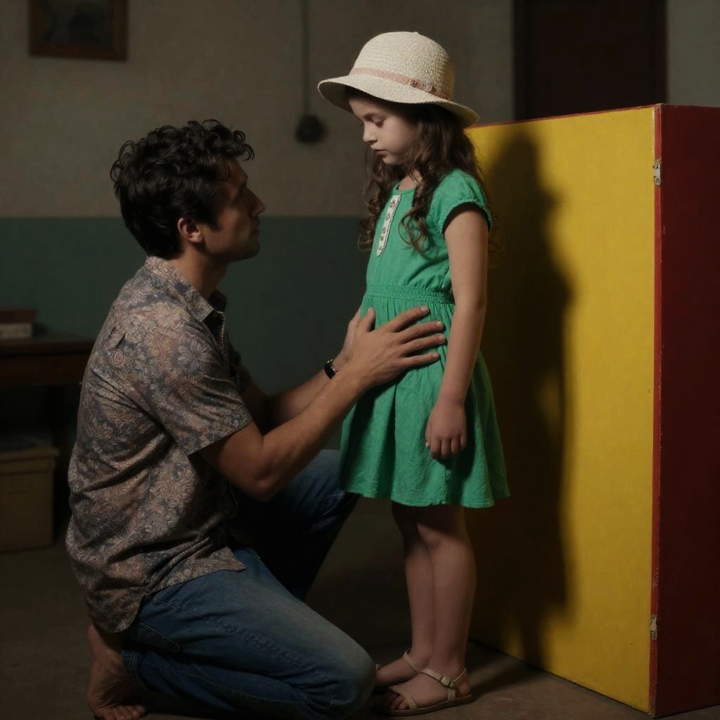 Photograph of a dark-haired man with curly hair, wearing a dark jacket, holding a young girl with straight brown hair and bangs, dressed in a striped sweater and purple pants. They stand closely together against a dimly lit, wooden background. The man's expression is serious, while the girl looks slightly curious. The lighting is moody and low, creating a somber atmosphere.