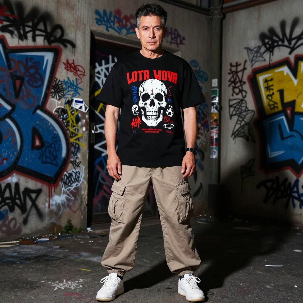 Middle-aged man in graphic tee and cargo pants in graffiti alley