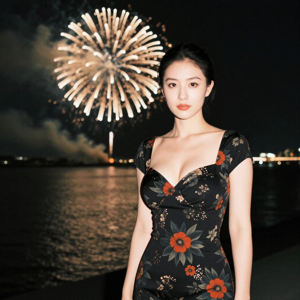A woman in a classic black floral sheath dress with short sleeves, standing by a fireworks display by the riverside, captured in an instant film style. Sexy. Pretty face and beаutiful eyes. Big breasts