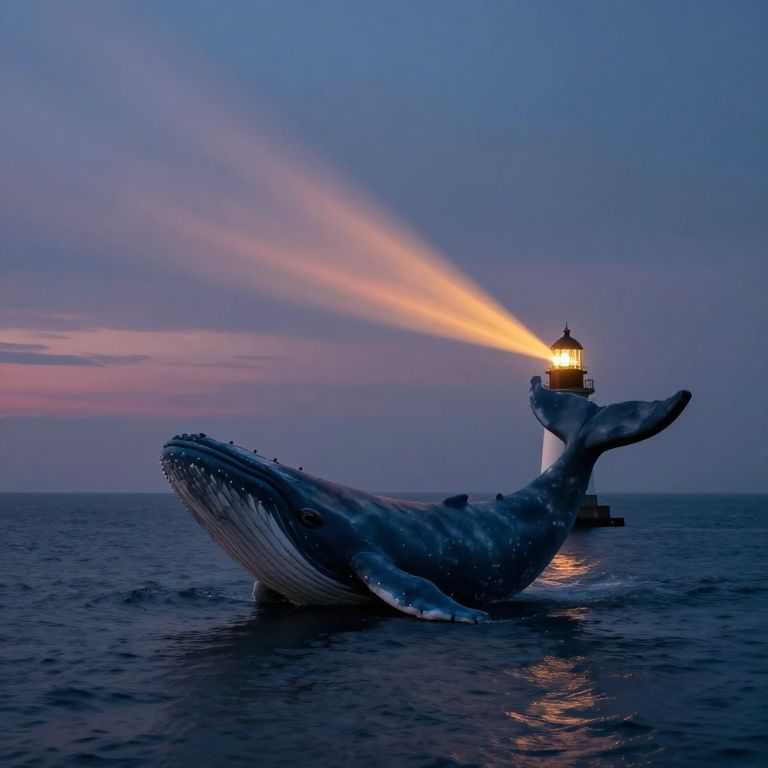 Amidst the enigmatic embrace of twilight, a lighthouse crafted in the form of a whale casts beams of vibrant smoke, symbolizing hope and guidance in a surreal seascape where land and sea intertwine, evoking a profound sense of wonder and introspection.