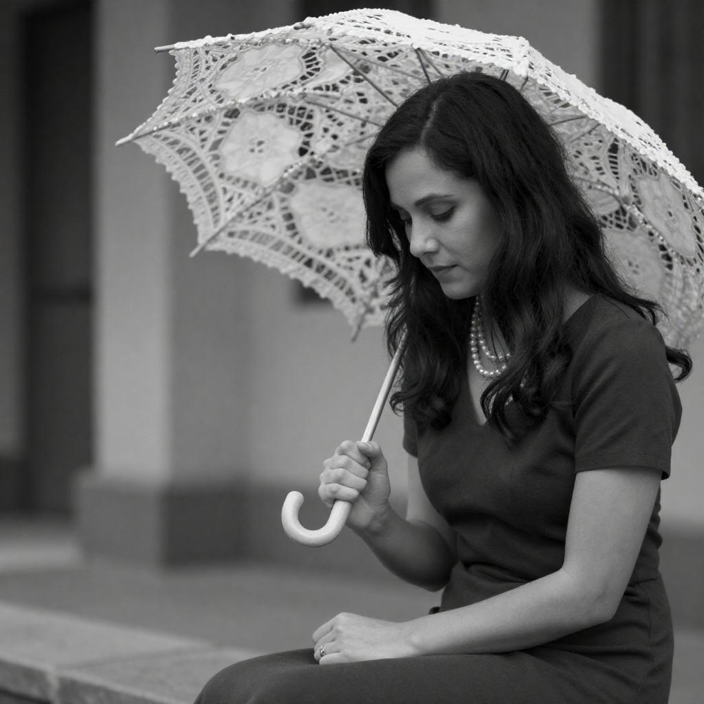 Black-and-white photograph of a woman with long dark hair, wearing a dark dress and pearl necklace, sitting under a patterned lace umbrella. She is looking down at her hand, which is raised slightly. The background includes a blurred stone wall and a tree trunk. The image has a vintage, nostalgic feel.