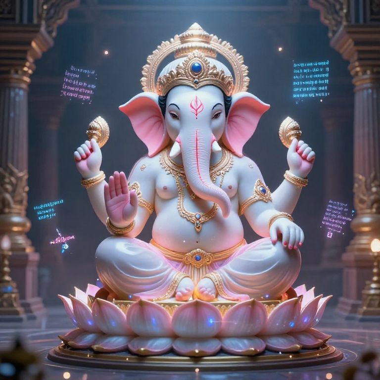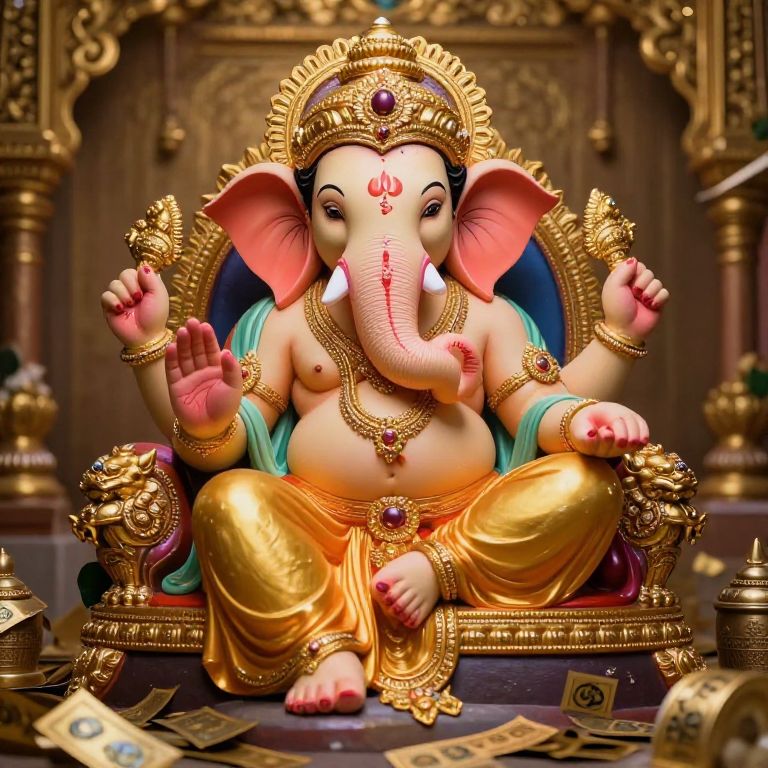 Scale Lord Ganesha lie on golden seat, relax mood with gold and money surround. 9:16 , full details, 4K,