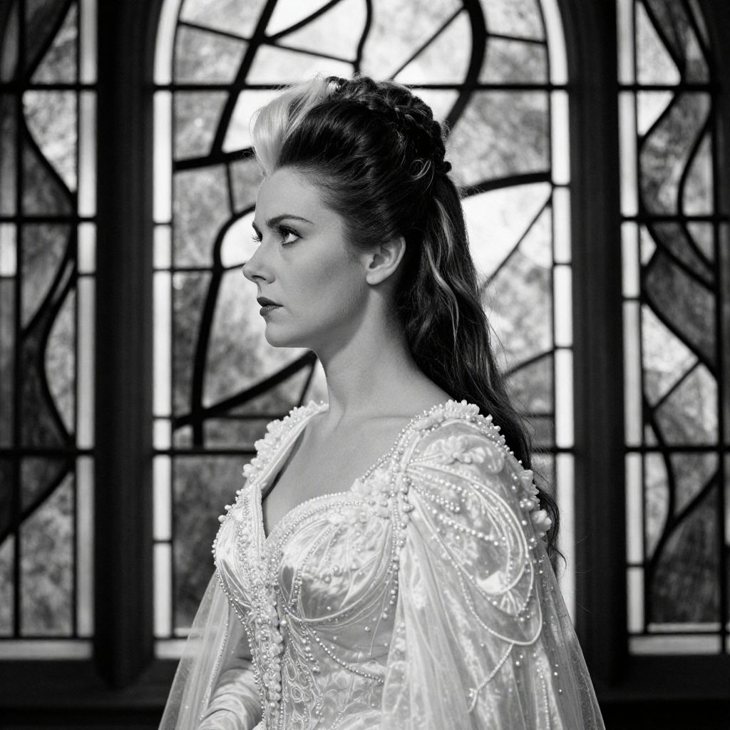 Bride of Frankenstein side profile portrait, classic black and white style with stained glass window backdrop, intense expression, iconic tall hair with white streaks, hermetically styled elegant wedding gown, vintage horror movie vibe, textured brushstrokes, surreal ambiance
