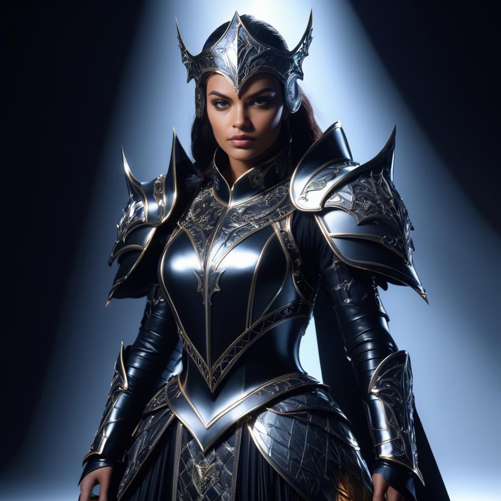 Enigmatic witch wearing Givenchy armor, luxury materials, cinematic and professional studio lighting, sharp focus, 4K.